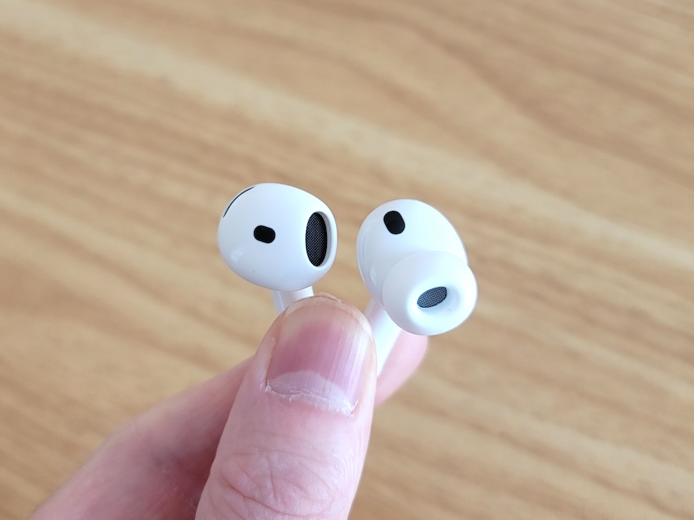 対してAirPods 4はイヤーピースがないので軽い装着感に強み。夏場だと蒸れなくてなおよし。一方、イヤホンが揺れがち。ズボラな人だとイヤホンが抜け落ちてることも。
