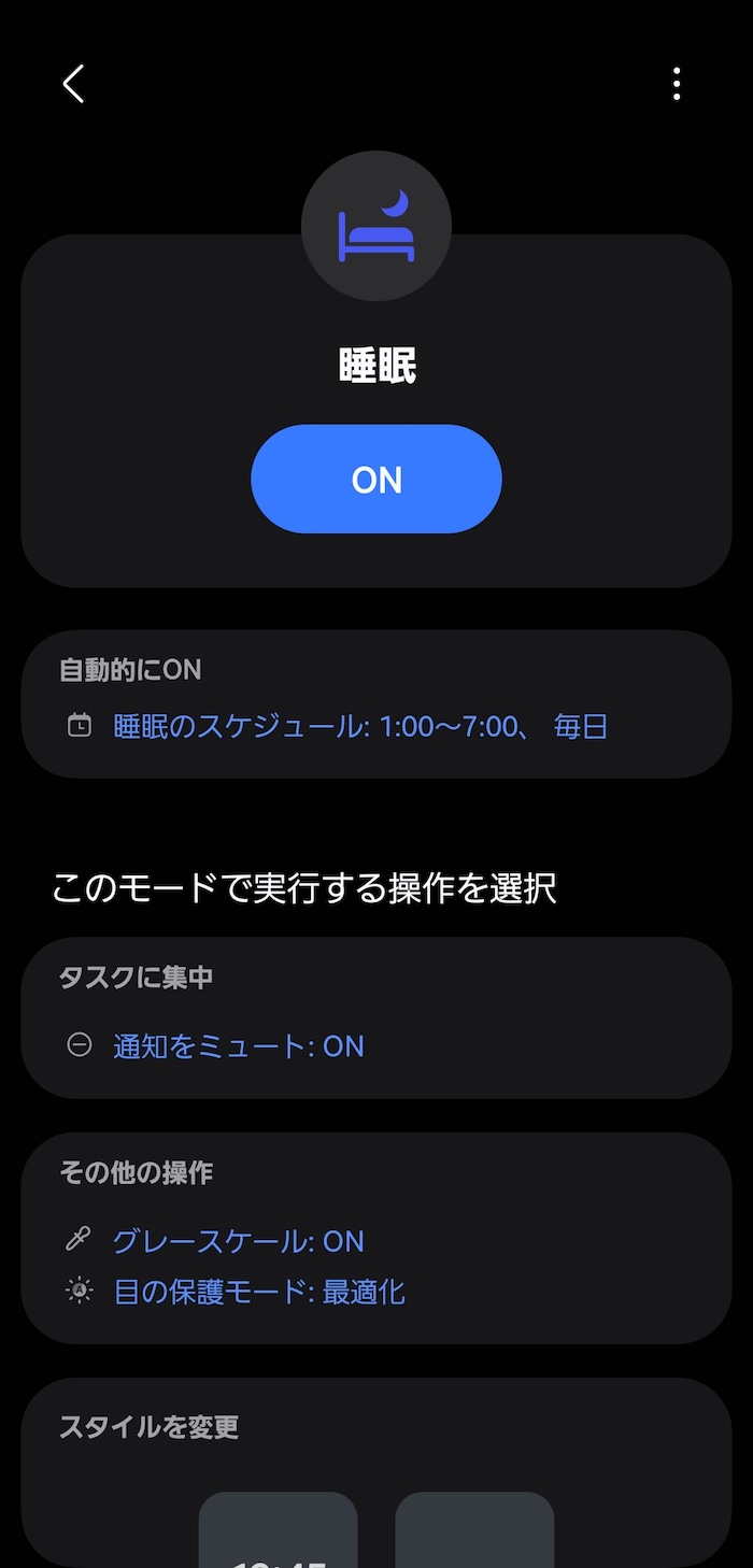 たとえば「睡眠中」モードであれば指定した睡眠時刻になったら通知をミュートし、画面を白黒化し、アラームをセットするなど一括で処理できます。