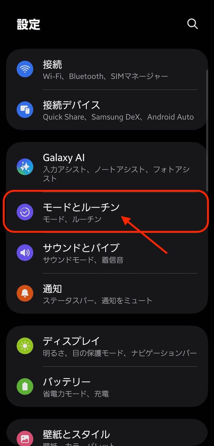 「設定」アプリのトップページの上から4番目前後に「モードとルーチン」の項目があるはず。ここから設定画面に入ってください。