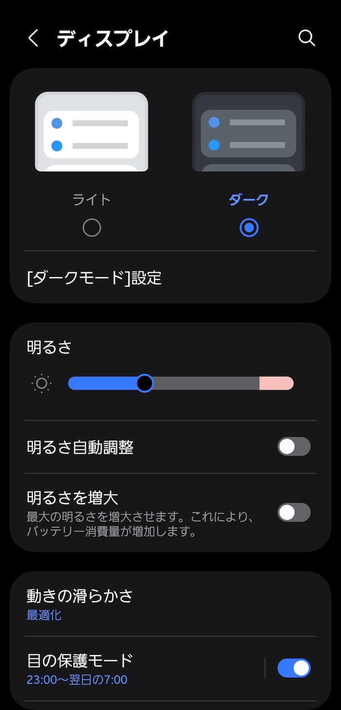 Galaxyスマホの伝統たる有機ELディスプレイはきれいなんですけど、常時最高スペックで使うとバッテリー持ちが悪め。同機能を活用してせめて映像コンテンツを見るときだけでも最高スペックで使いたい。