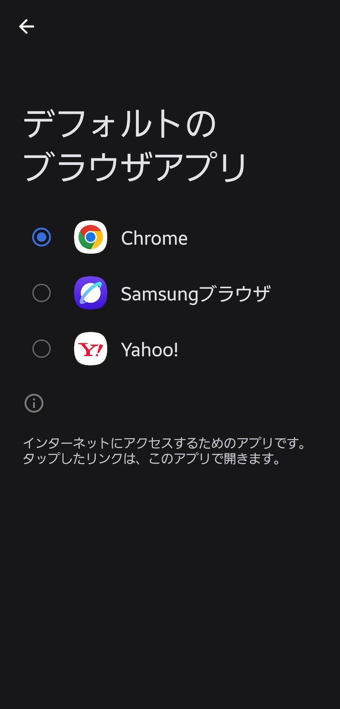 デフォルトだと「Samsungブラウザ」の指定あり。Chromeあたりに変更したい人だと必須カスタマイズ。
