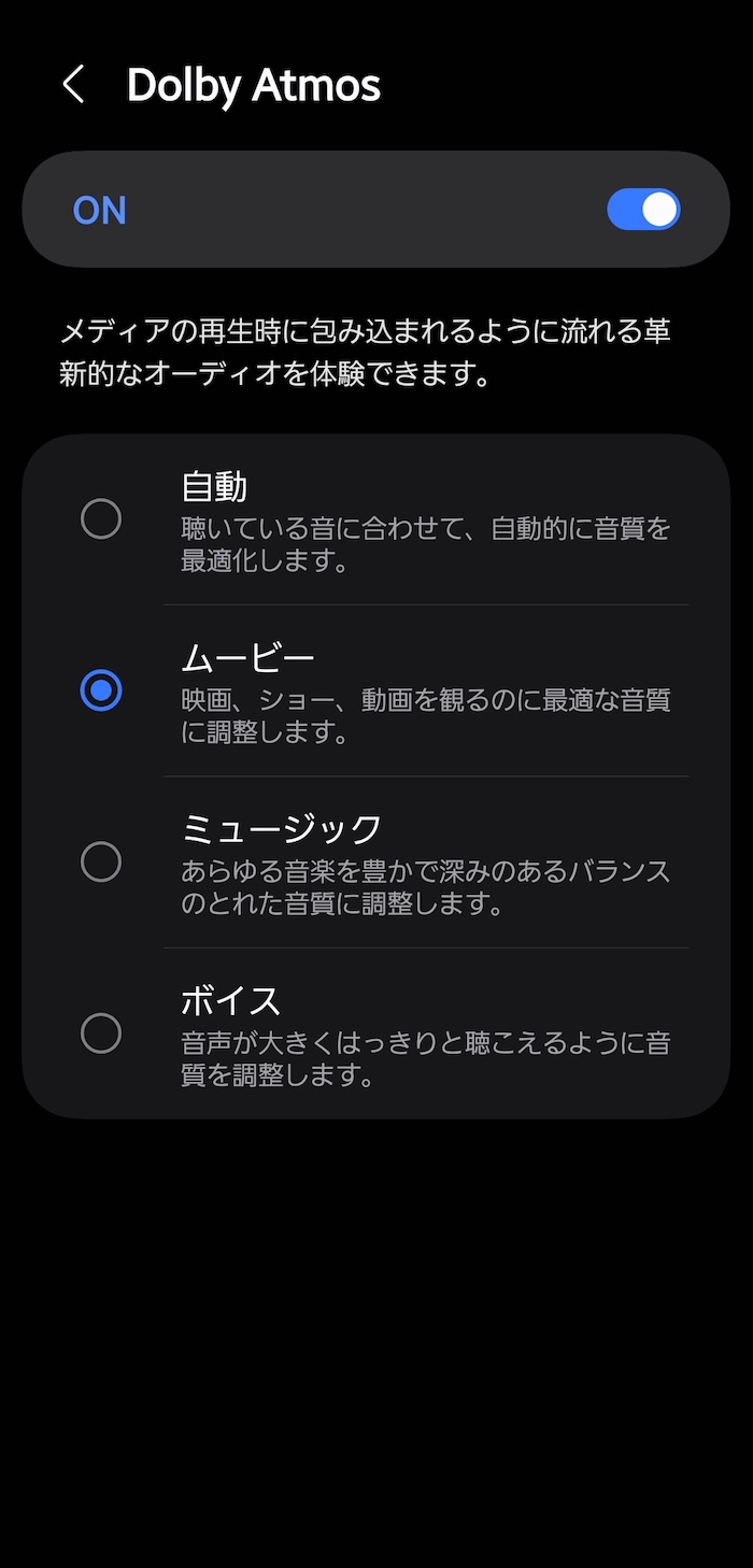GalaxyスマホはDolby Audioに標準対応あり。機能ONにすればアプリや音源に関係なくオーディオ再生を立体音響化できます。