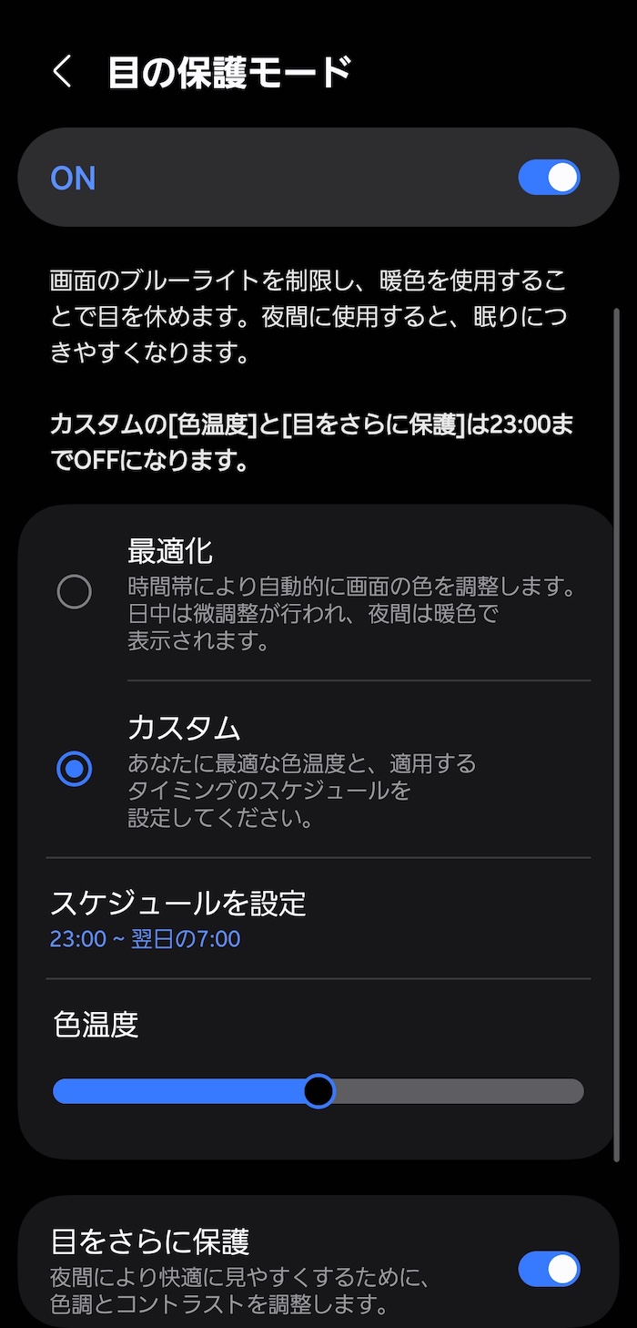 指定した時間中、画面を暖色にしてブルーライトカットできます。