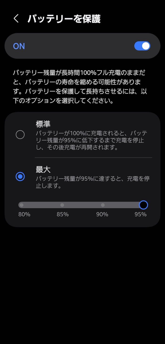 バッテリー過充電を防ぐための同機能。充電上限%を100%ではなく80%〜95%の間で調整できます。