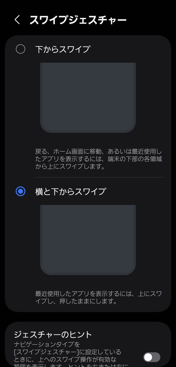 - 「横と下からスワイプ」を指定