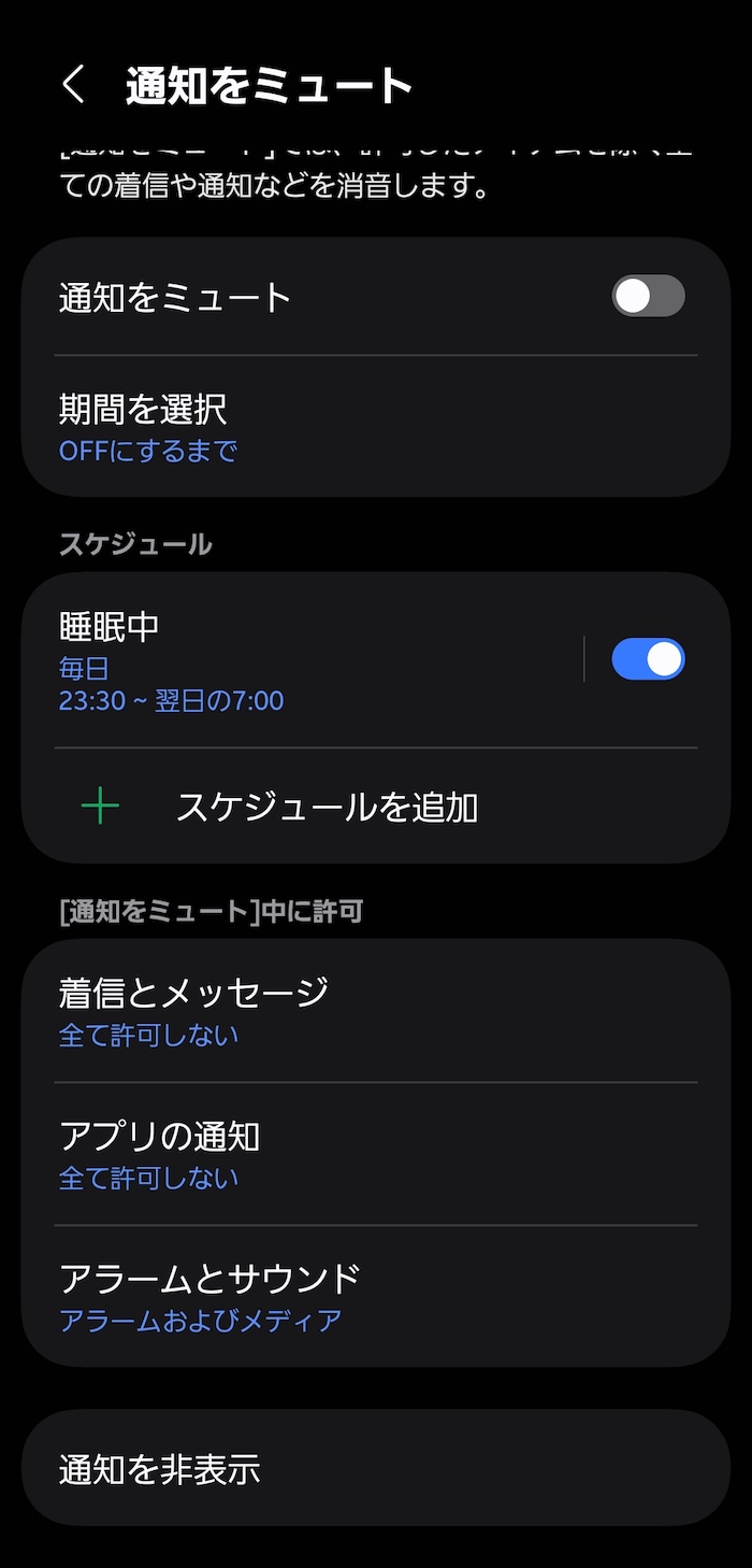 指定した時間帯のみ通知をミュート(完全OFF)できる同機能。Galaxyのデジタル・ウェルビーイング機能の1つです。