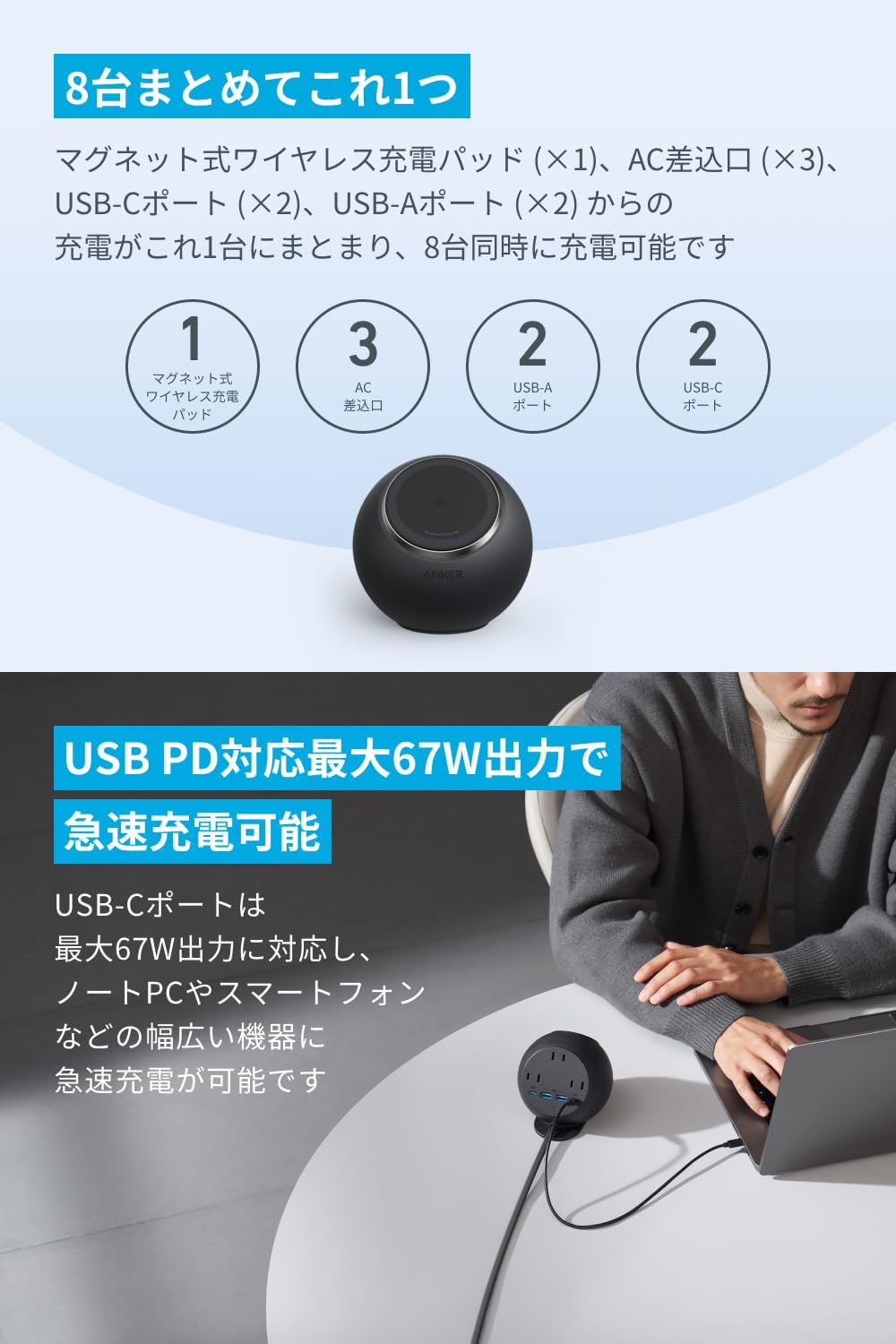 ワイヤレス充電器(MagSafe充電器)として使えるほか、背面にAC電源ポート3つ、最大67W対応のUSB PD(USB Type-C)ポートを2つ、ほかUSB Type-Aポート2つを備えるデスク整理ガジェットです。