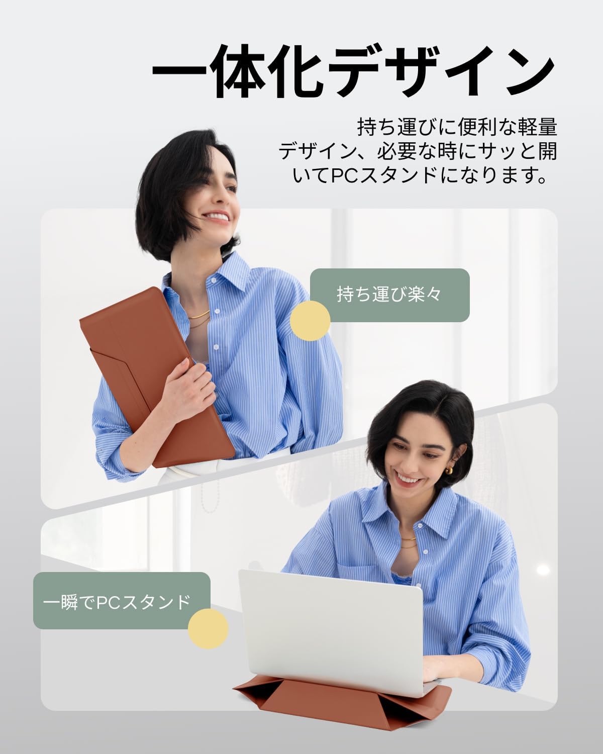スリーブケースを折り上げればPCスタンドになるギミックあり。出先でPCワークする機会が多い人だと地味に重宝する機能です。