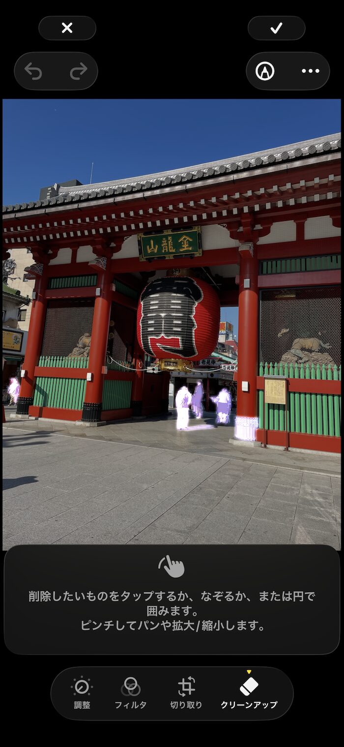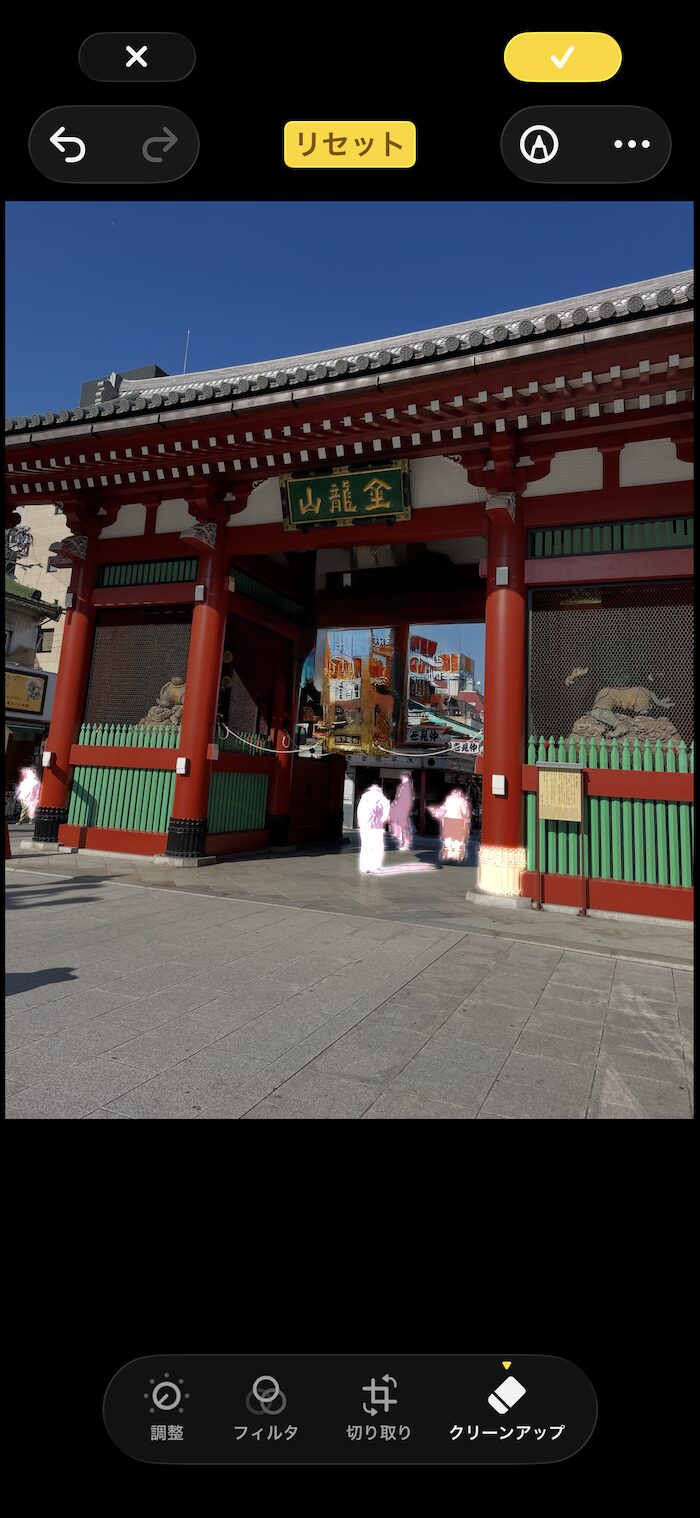 写真上の光っている部分をタップすると当該部分を削除できます。