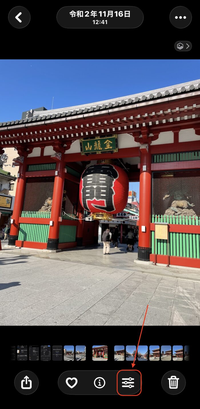 編集したい写真を開き、編集ボタンをタップ。