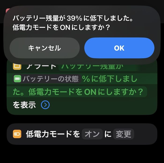 4. バッテリー残量が特定%以下になったら通知&低電力モードに切り替えるショートカット