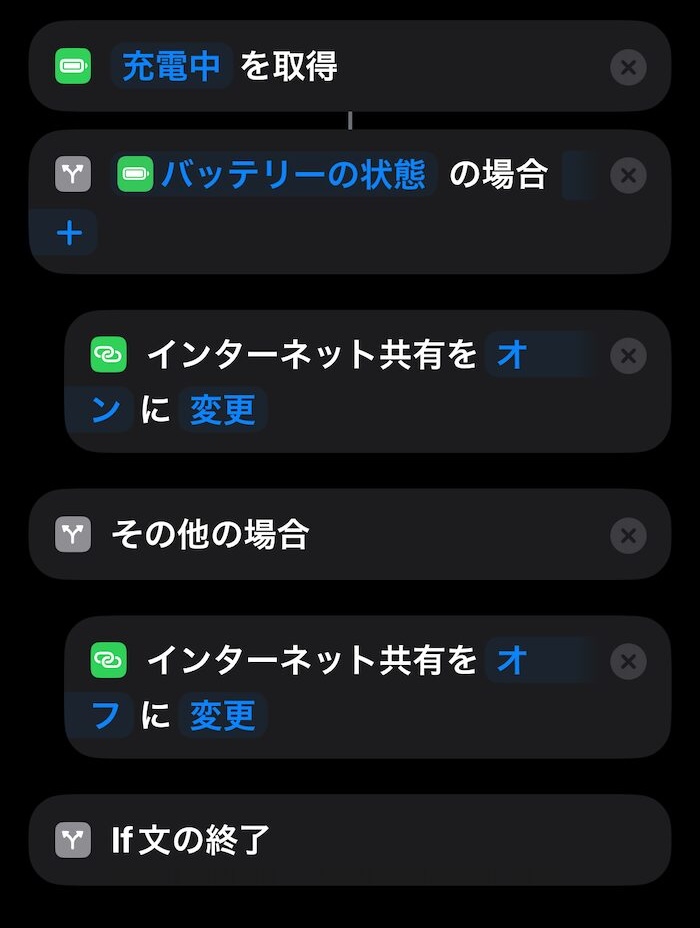 充電を開始したタイミングでテザリング(インターネット共有)を自動ON。充電を解除したタイミングでテザリングを自動OFFします。