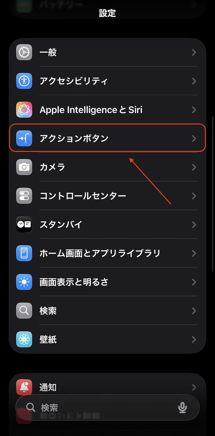 「設定」アプリを開き、「アクションボタン」項目をタップします。