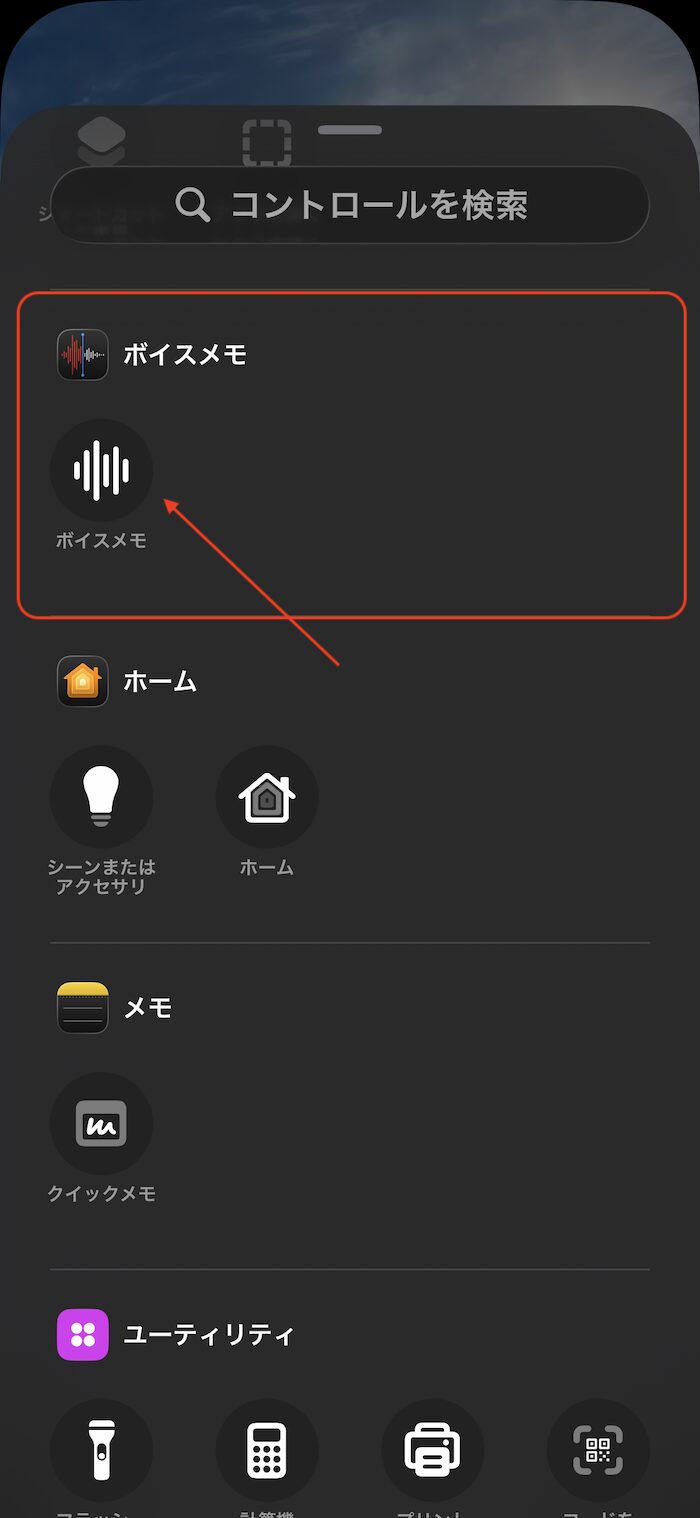 項目を横にスライド。「ボイスメモ」を指定します。