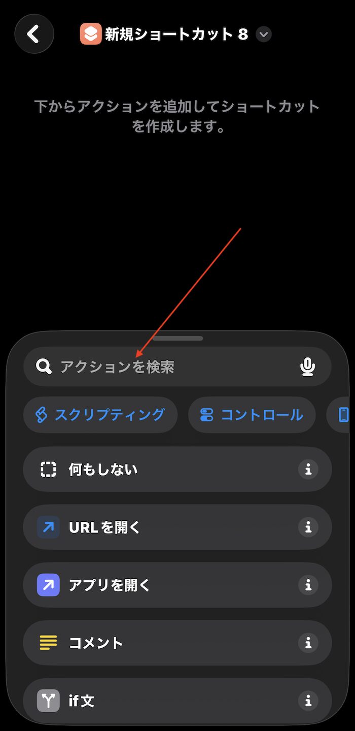 「ショートカット」アプリを開き、新規ショートカットの作成画面を展開します。