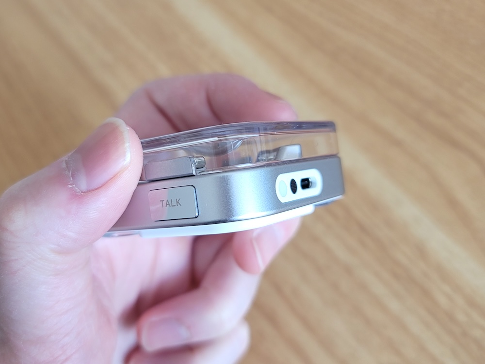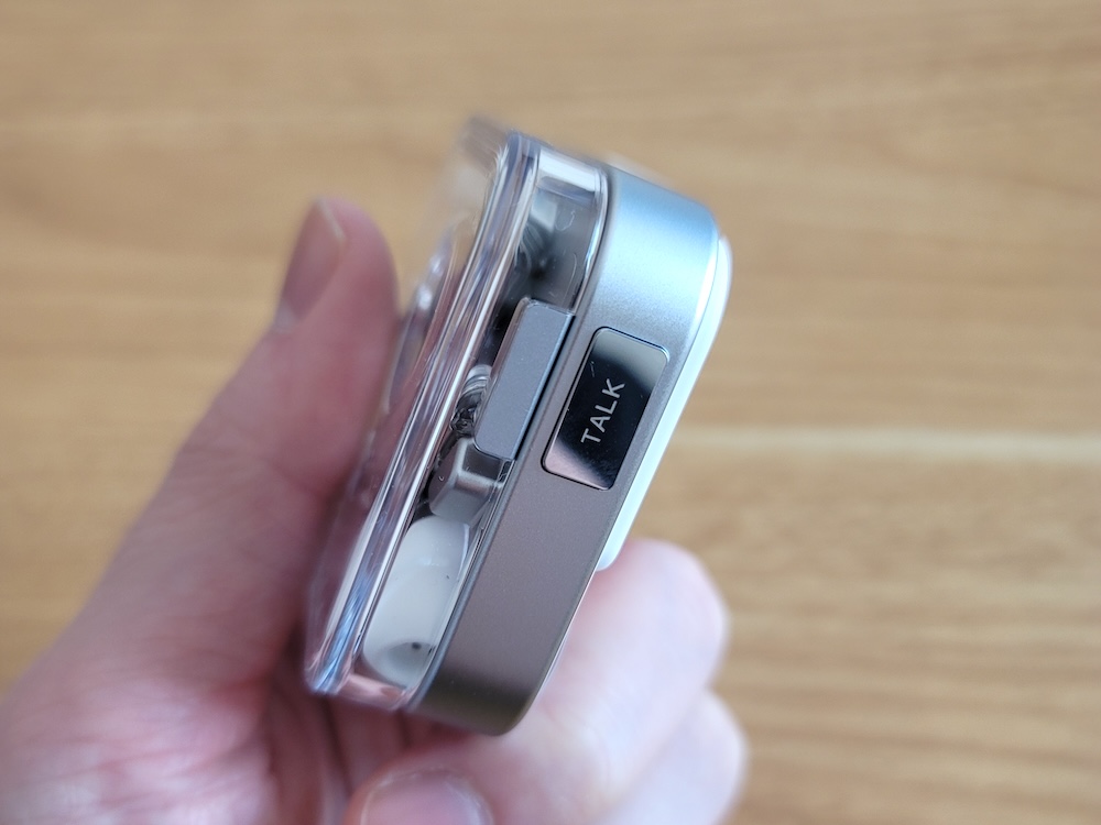 ケース側面にあるマイク(正式名称は"スーパーマイク")も利用可能。ケース側面の「TALK」ボタンを2回押すと「イヤホン本体←→ケース」のマイクが切り替わります。