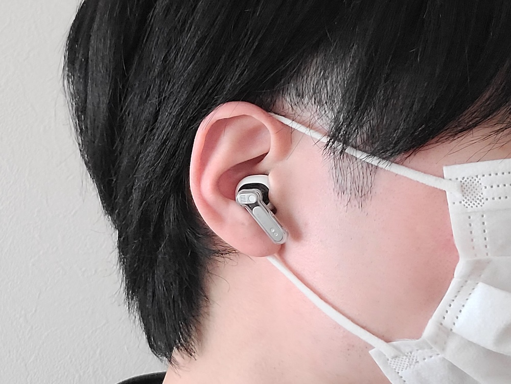 ステム短めなので耳元ですっきり収まります。マスク紐への干渉もほぼありません。