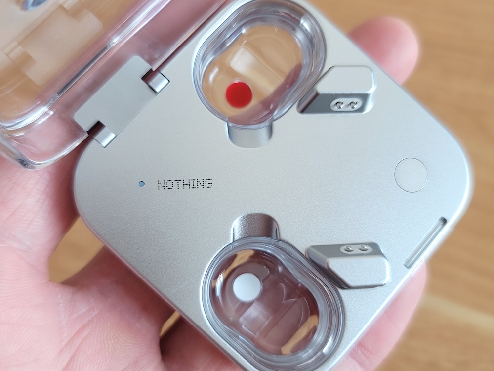 充電ケース・デザインは前作モデルから変わらず。上蓋が透明でイヤホンを魅せるデザインです。