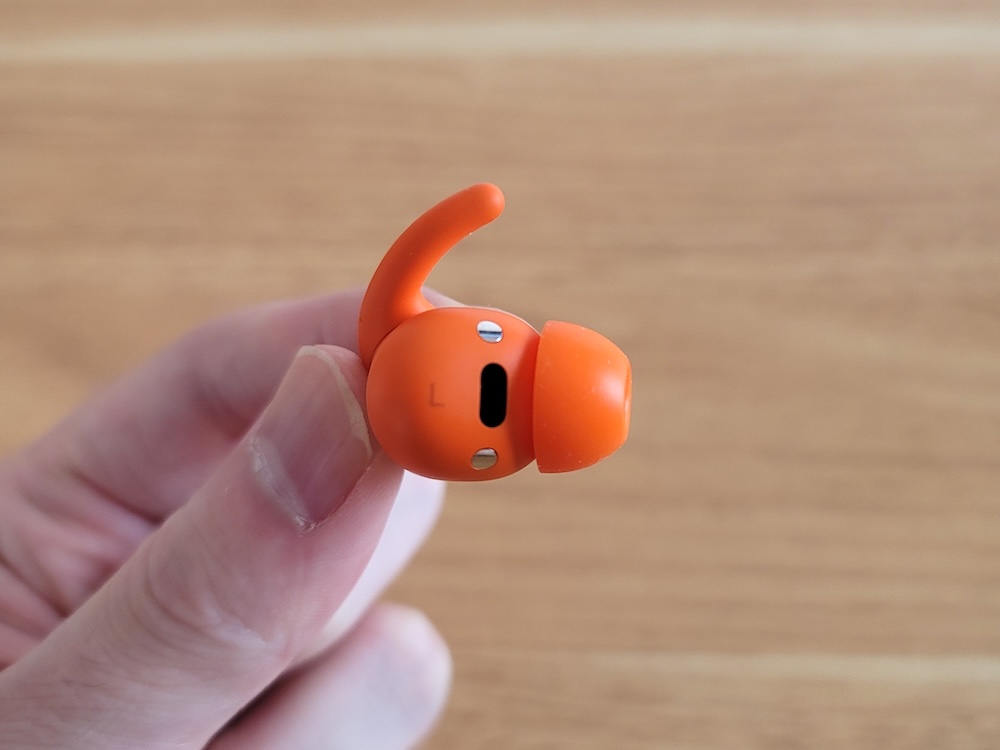 イヤーウィングはシリコン素材。適度に硬く、適度に柔らかめ。耳のひだに引っかかってイヤホン保持します。