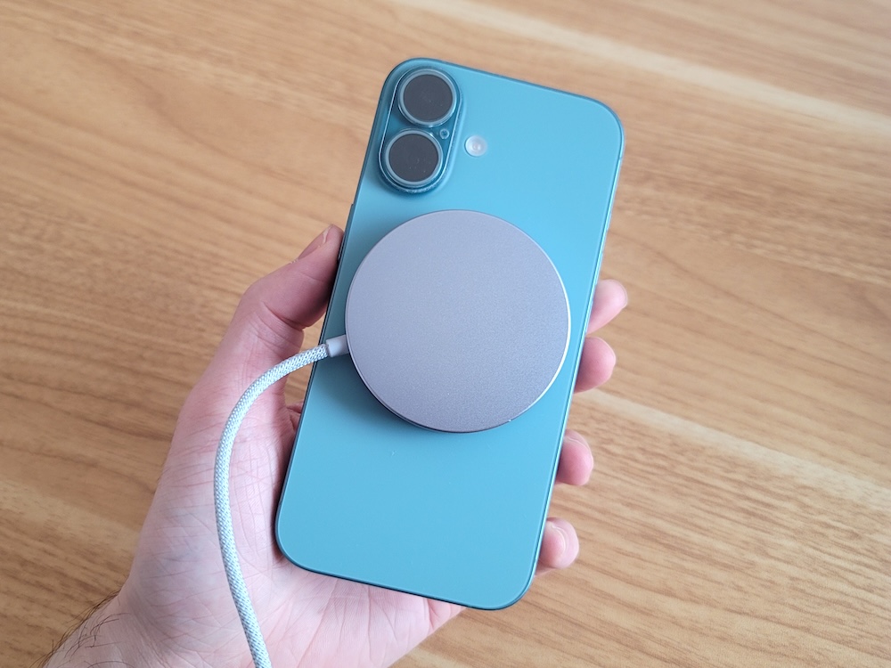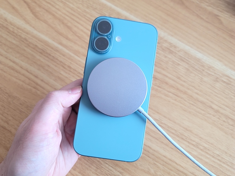 一世代前のQi2.0と同じくMagSafeとの互換性あり。マグネットでくっつけて固定して充電できるのも特徴です。
