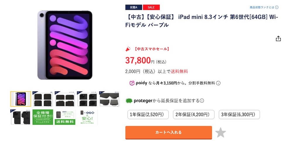 中古Aランク(非常に良い)、Wi-Fiモデル、ストレージ64GBの構成で最安37,800円に。イオシスだと同等品が47,800円〜、じゃんぱらだと42,980円〜なので37,800円は中古界隈でほぼ最安ですね。