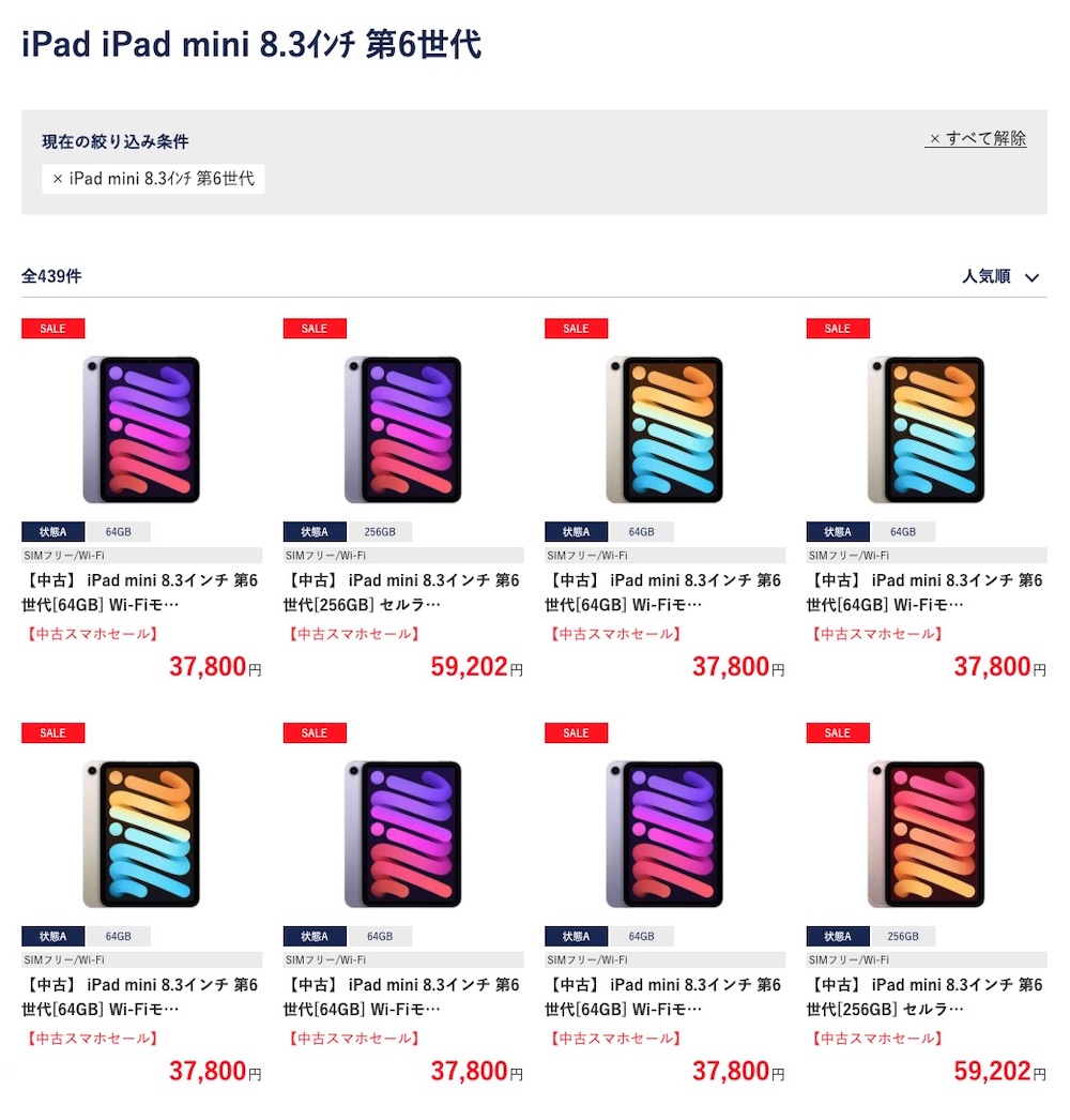 なかでも注目はiPad miniの一世代前モデル「iPad mini(第6世代)」。37,800円〜購入できる大特価プライスです。