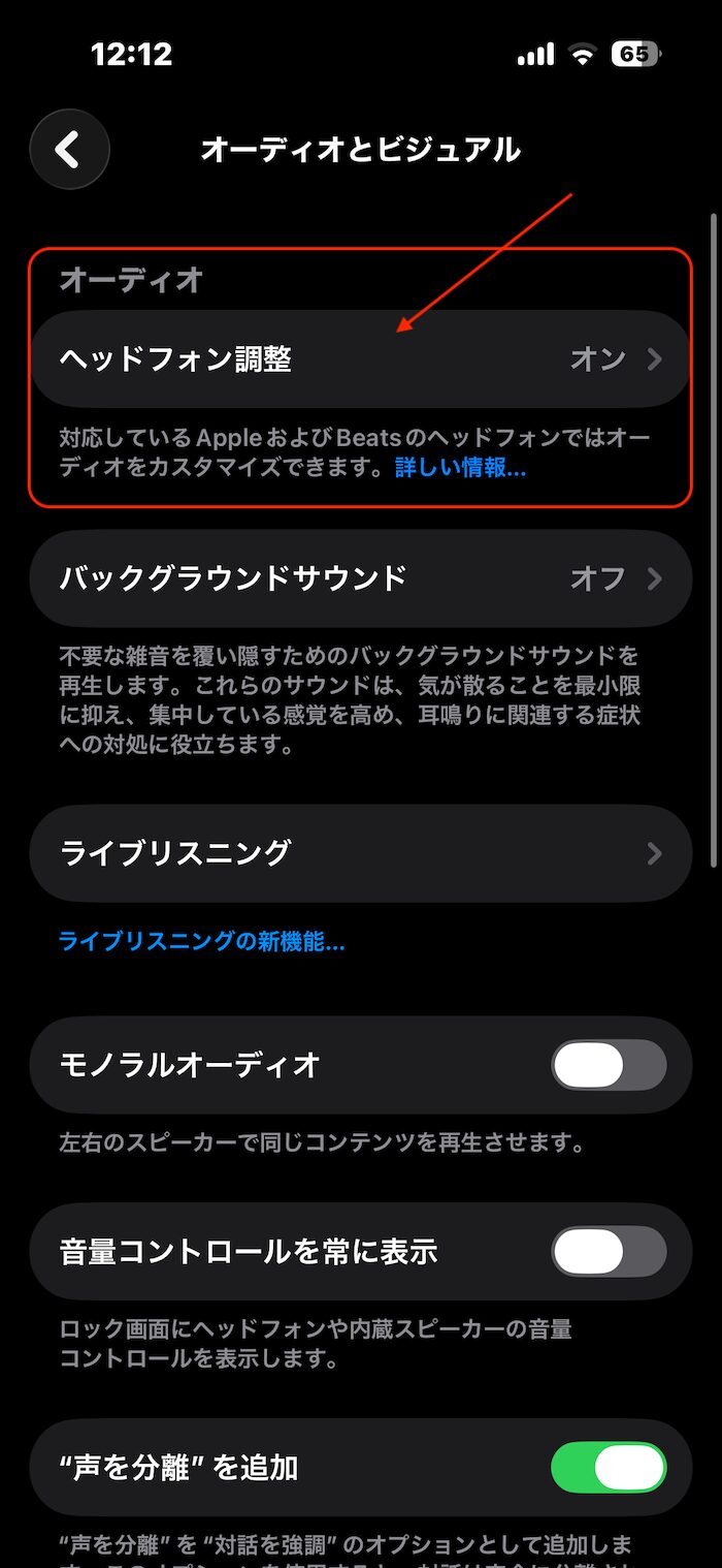 「アクセシビリティ」→「iPhoneの"オーディオとビジュアル"設定」→「ヘッドフォン調整」と進みます。