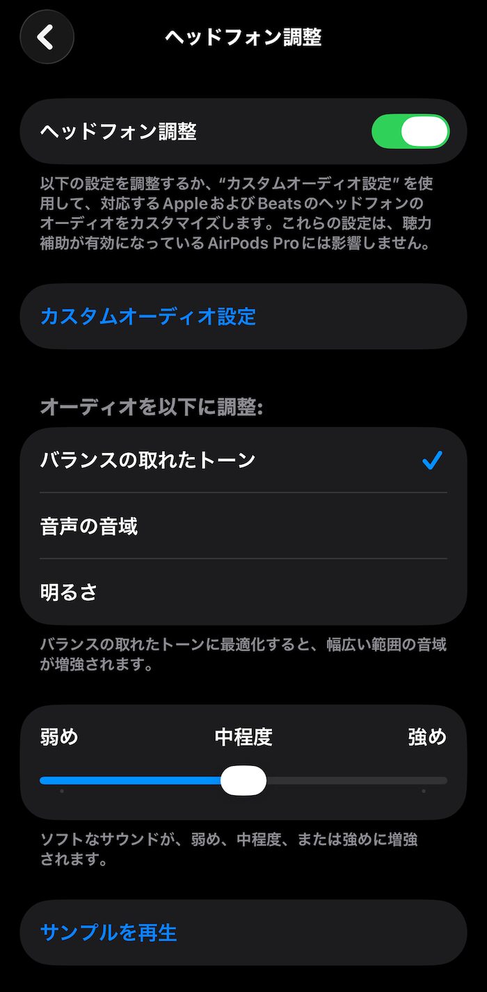 「オーディオを以下に調整:」をタップすると音のトーンを変更。