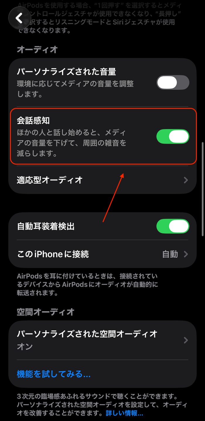 先に紹介した「適応型オーディオ」と組み合わせれば、たとえばコンビニレジなどで喋るときだけ外音取り込み機能をONにしつつ、オーディオ音量も自動で下げられます。