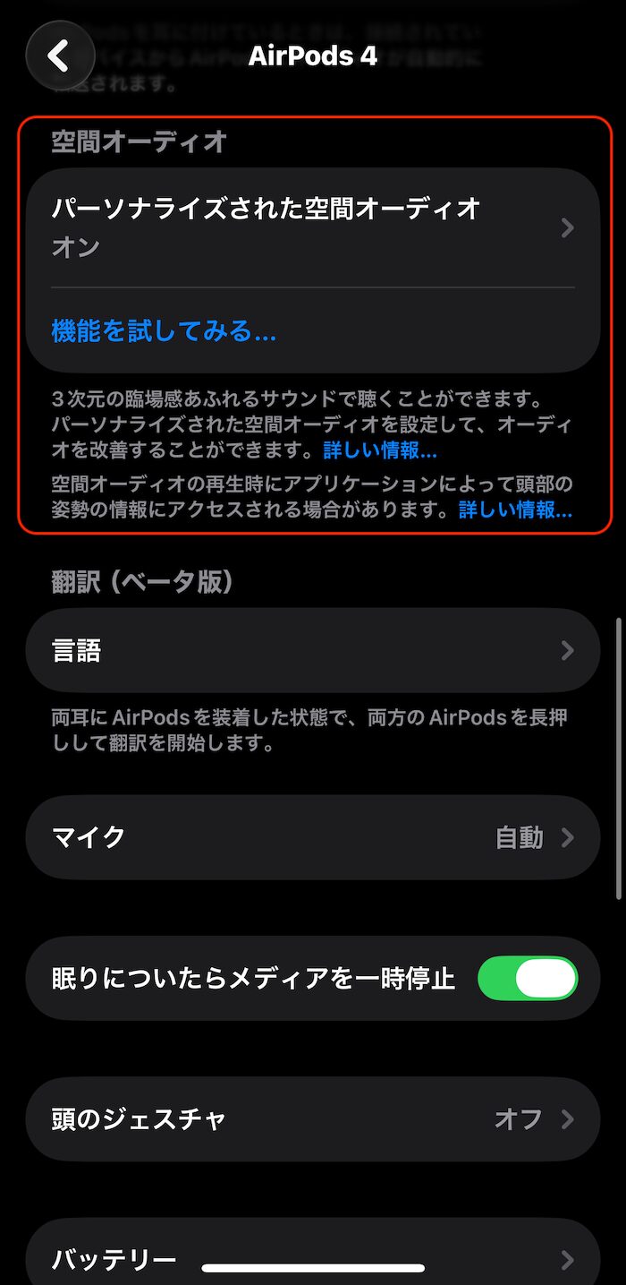- 「パーソナライズされた空間オーディオ」をタップして設定開始