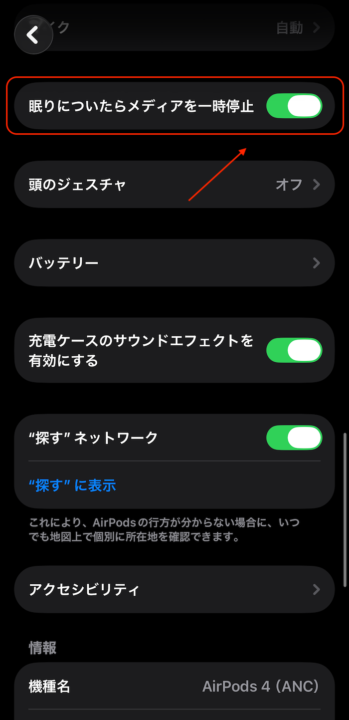 AirPods装着時に寝落ちすると自動でメディア再生を停止させます。