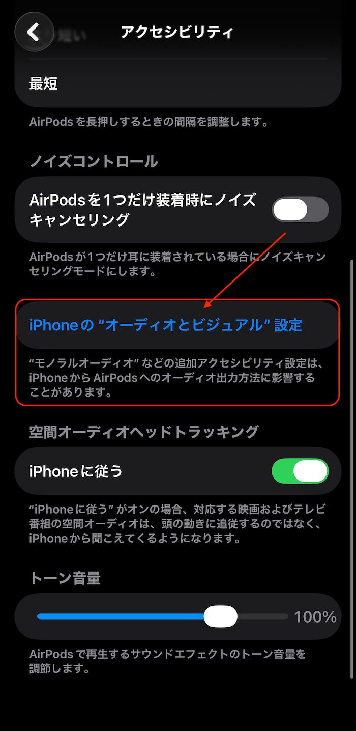 「アクセシビリティ」→「iPhoneの"オーディオとビジュアル"設定」と進みます。
