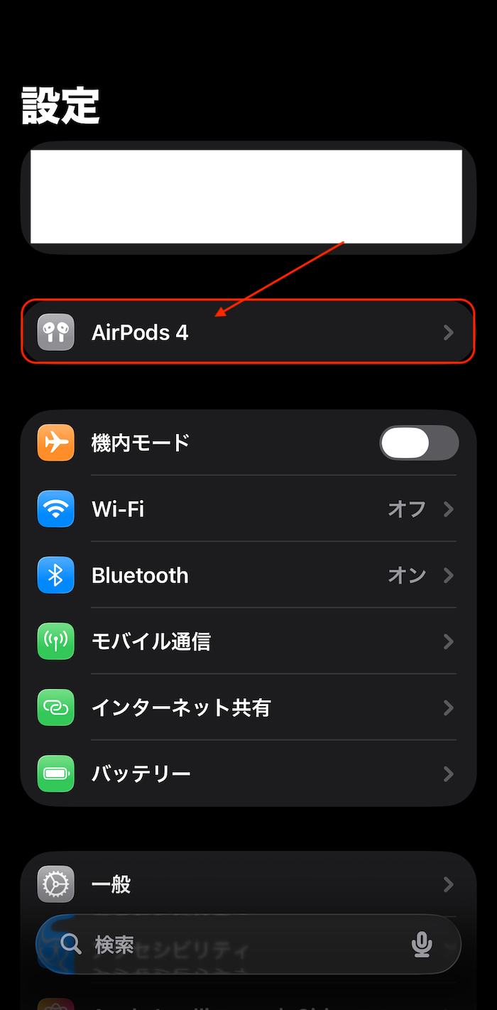iPhone・iPadと接続した状態なら↓以下のように「設定」アプリの上2番目の項目に「AirPods」の設定項目が表示されます。