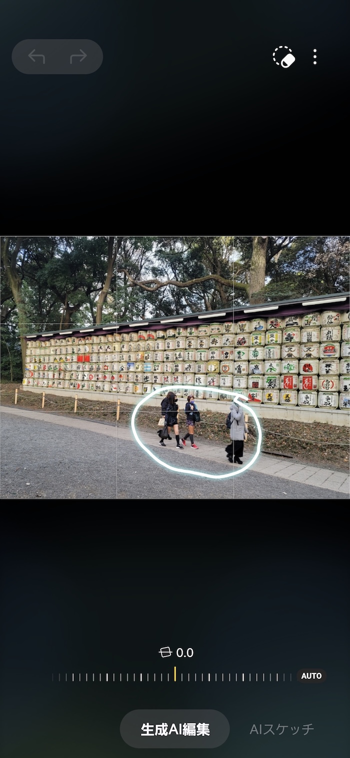 Google Pixelでおなじみ「消しゴムマジック」。AI機能を活用したフォトショ機能ですね。写真から不要な部分を削除しつつ、背景をAI生成して自然に仕上げてくれます。